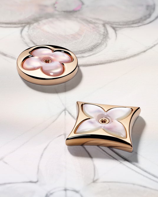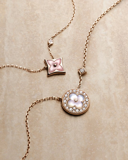 インスピレーションを与え続ける、モノグラムのクリエイティブなスピリット。そして「カラー ブロッサム」に新たなジュエリーが加わることで、より多彩で自由なスタイリングが叶います。サンとスターのモチーフを交互に配した2点の新作ショートネックレスは、ピンク マザー・オブ・パールまたはマラカイトで展開。さらに、ピンクとホワイト マザー・オブ・パールにスターとサンのエンブレムを組み合わせた、優美なロングネックレスも登場します。