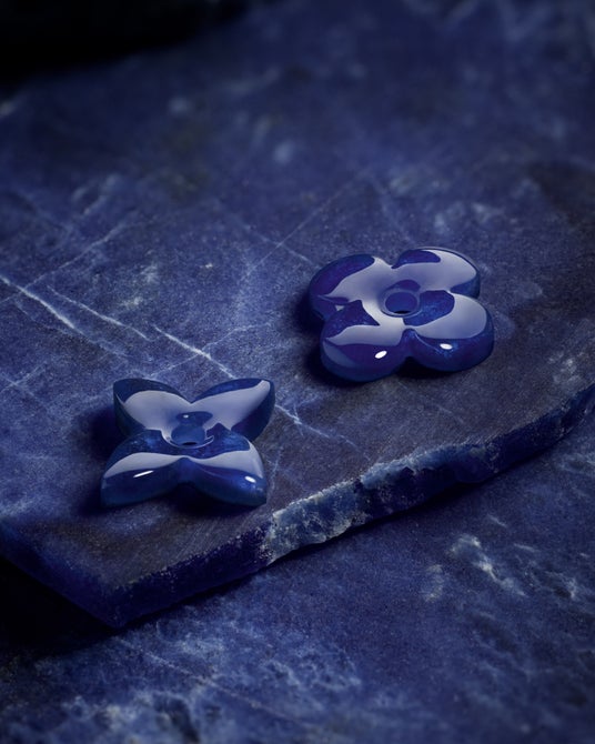 最高の品質と色彩を追求し、「カラー ブロッサム」では厳選されたソーダライトを使用しています。原石は、他の「カラー ブロッサム」コレクションのジェムストーンと同様に、厳格な宝石研磨の工程を経て、特徴的な立体感とシグネチャーであるボンベシェイプへと丁寧に彫刻・加工されます。妥協のない入念な選定作業を経た原石はカットされ、再度検品を受けた後、成形工程へと進み、ここでモノグラム・フラワーが立体的なフォルムとして命を吹き込まれます。完璧な対称性と光の反射を実現するためには、卓越した専門技術を要する極めて高度なカットと研磨の工程が不可欠です。さらに、ハードストーンそれぞれの特性に応じた精緻なクラフツマンシップも求められます。こうした彫刻には、フラットなストーンの研磨と比べて最大で5倍の時間を要しますが、立体的に彫り出すことでジェムストーン本来の素材の魅力が引き出され、その美しさと奥行きが一層際立ちます。