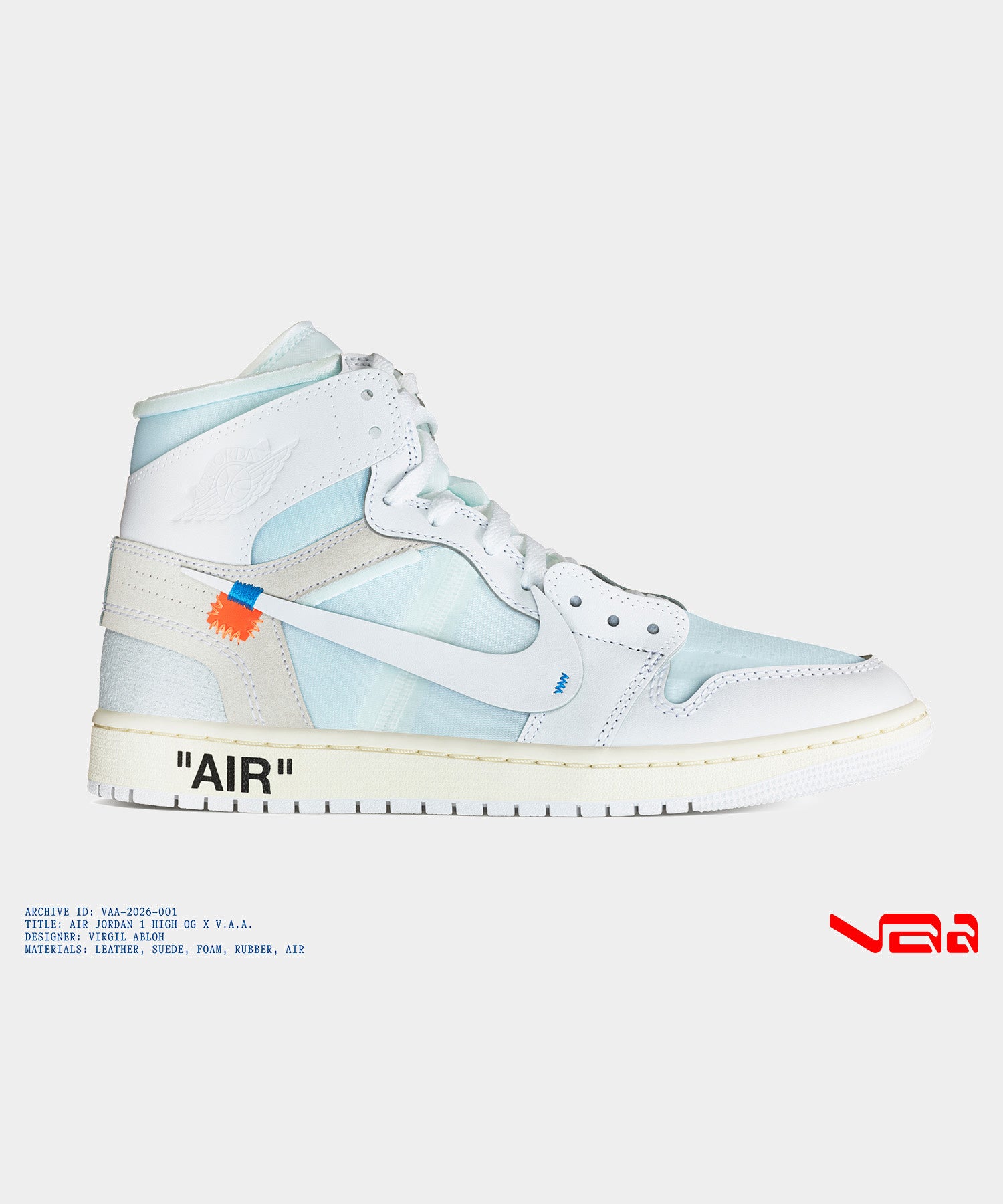 「AIR JORDAN 1 HIGH OG X V.A.A.」には、ヴァージルの象徴的なデザイン要素が反映されています。露出したタン、スウッシュに配されたオレンジタブ、そしてミッドソールに搭載されたナイキのクラシックなエアユニットの上に直接プリントされたブラックの「AIR」ロゴが特徴的です。