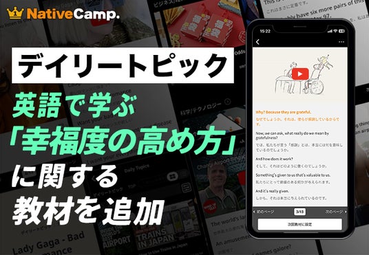 レッスン回数無制限のオンライン英会話サービス「ネイティブキャンプ英会話」を展開する株式会社ネイティブキャンプ(東京都渋谷区 代表取締役:谷川国洋)は、人気教材「デイリートピック」において、現代社会で関心の高まっている「ウェルビーイング(Well-being)」をテーマにした新教材を公開いたしました。