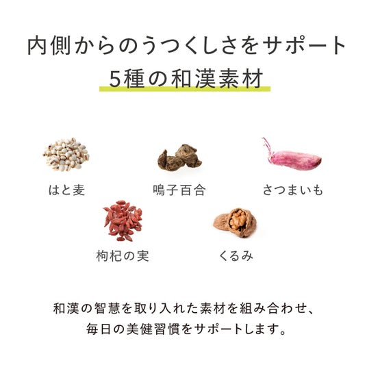 本製品は、美容和漢素材として知られるはと麦に加え、油脂コーティングタイプのビタミンCを採用。さらに「酸甘化陰(さんかんかいん)=酸味と甘味を組み合わせると潤いが生まれる」という和漢の智慧を活かし、5種のフルーツと6種のグリーン素材、5種の和漢素材をバランスよく配合しました。内側からの印象を大切にしたい方の毎日に、手軽に取り入れられる美健習慣としておすすめです。
