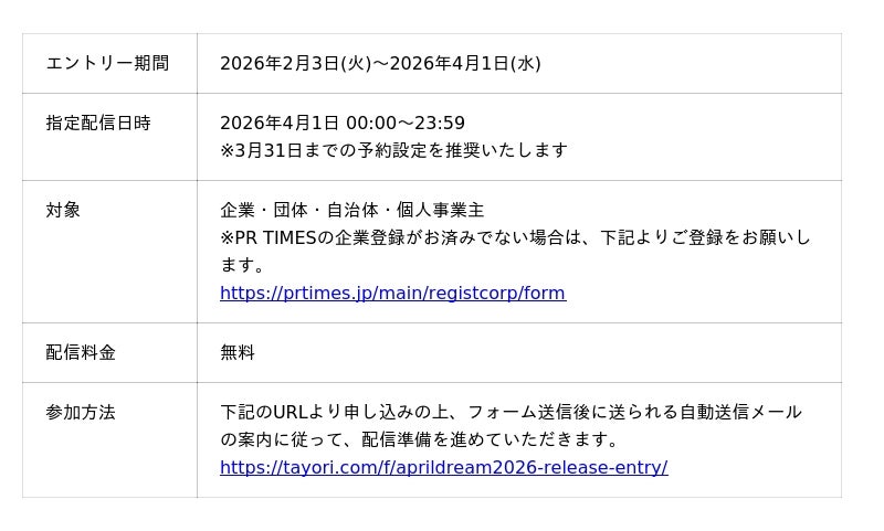 PR TIMESは、企業・自治体・各種団体・個人が、4月1日に“ウソ”ではなく“夢”を「April Dream(エイプリルドリーム)」として発信する新たな文化を提唱しています。 発信することが、自分自身への決意になるかもしれない。発信することで、思わぬ協力者に出会えるかもしれない。April Dreamの機会に夢を言ってみることで、夢実現の一歩になると信じ、夢を発信できる場をつくり、呼びかけています。