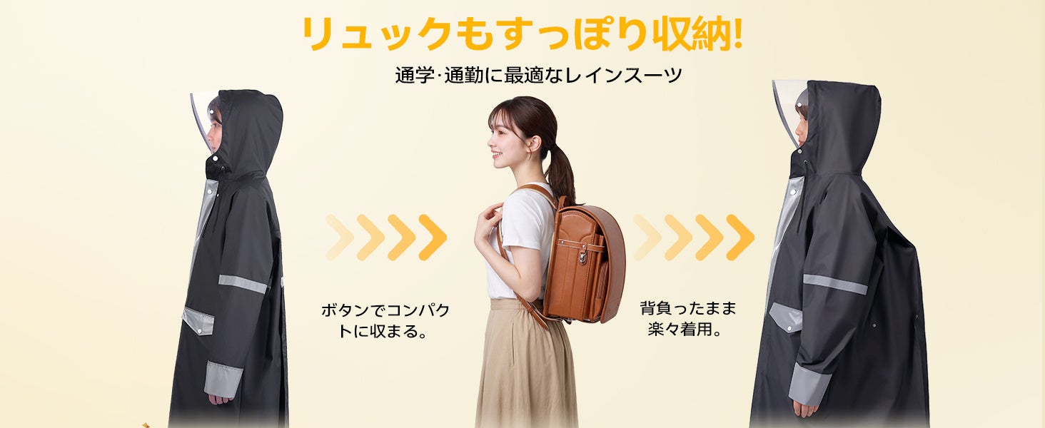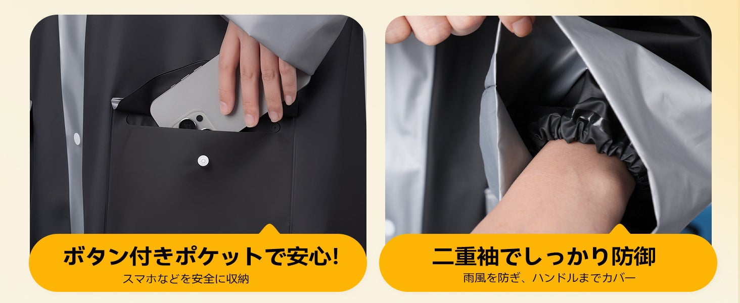 背中部分にゆとりを持たせた3Dカットを採用。リュックを背負ったままでも窮屈感なく着用でき、大切な荷物を濡らしません。二重袖構造により、自転車のハンドル操作時も手元への浸水を防ぎます。