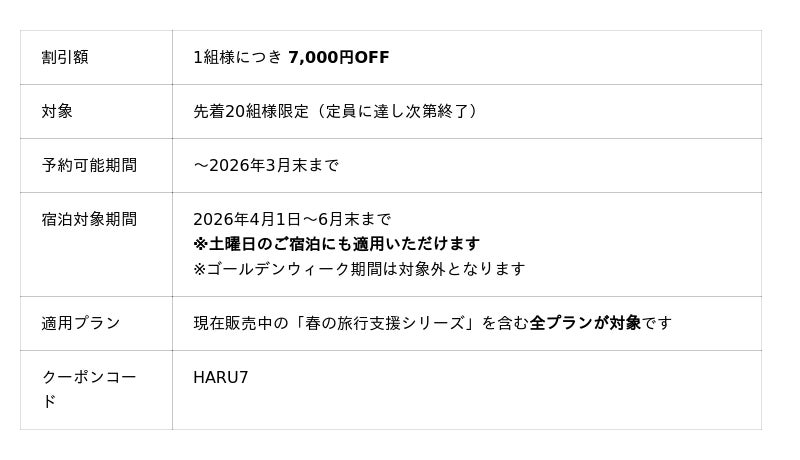 本キャンペーンでは、若者旅を応援する「U30割」や、家族旅行に嬉しい「小学生以下無料」、グループ旅行が10,000円OFFとなる特別プランなど、多様なニーズに応えるラインナップを展開。さらに、公式サイトでは先着20組様限定で、土曜日も利用可能な「7,000円OFFクーポン」を配布いたします。