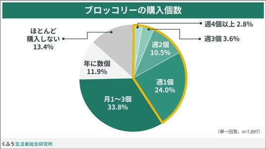ふだんブロッコリーをどのくらい購入しているかをたずねたところ、最も多かったのは「月1~3個」(33.8%)という回答でした。週1個以上買っている人が約4割と、食卓におなじみの野菜であることがわかります。