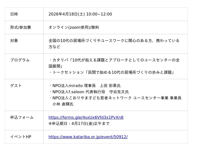 こうした社会の動きを背景に全国で居場所づくりの機運が高まるなか、実践からさらなる居場所の可能性を探るべく、連続イベントとして4月18日より「10代の居場所EXPO2026」を開催します。