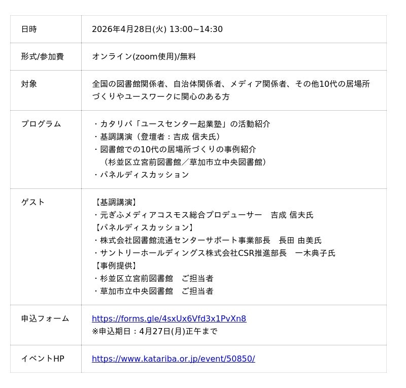 ー「図書館活用の可能性」「民間の居場所づくりのリアル」「自治体による居場所づくり推進」の3テーマで連続開催「10代の居場所EXPO2026」ー