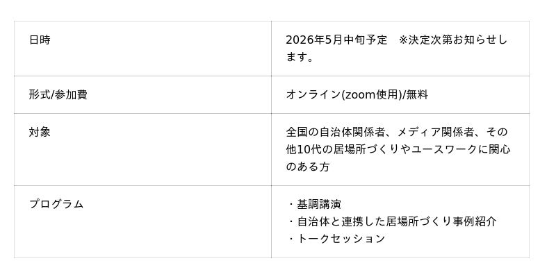 昨年に続き、2回目の開催となる今回は、これまで民間団体・図書館・自治体・企業と協働しながら実践されてきた居場所づくりの事例を共有し、居場所の価値を再発見するとともに、社会全体で10代が安全で安心できるような居場所をどのように広げていくのか、その“これから”を考えます。
