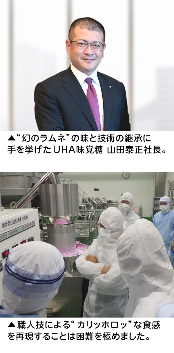 常々、「この味と技術を後世に残したい」と思っていた平口社長。そんな中、声をかけたのがUHA味覚糖株式会社の山田泰正社長でした。次々と新しいお菓子を世に送り出し続ける山田社長の新しい感性に平口社長は共感、さらなる開発意欲が湧いてくる期待も抱き、レインボーラムネの技術を継承することを決意しました。