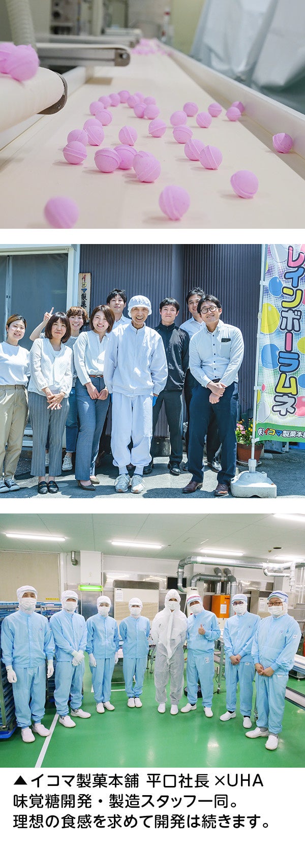 平口社長のレインボーラムネに求める理想は「たこ焼きのような食感」。まだ完全には理想にたどり着いていないと、平口社長は現在も定期的に味と食感の確認のためにUHA味覚糖を訪れています。発売して終わりではなく、ここから更なる進化と品質の安定を目指してレインボーラムネの開発は続きます。