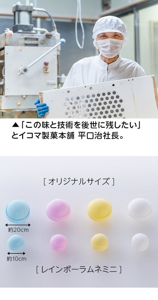 この共同開発を通じて両者の信頼関係もより強固なものとなり、「100年後も残したい味」プロジェクトと銘打って、いよいよオリジナルサイズのレインボーラムネの技術と味の継承に取組みます。