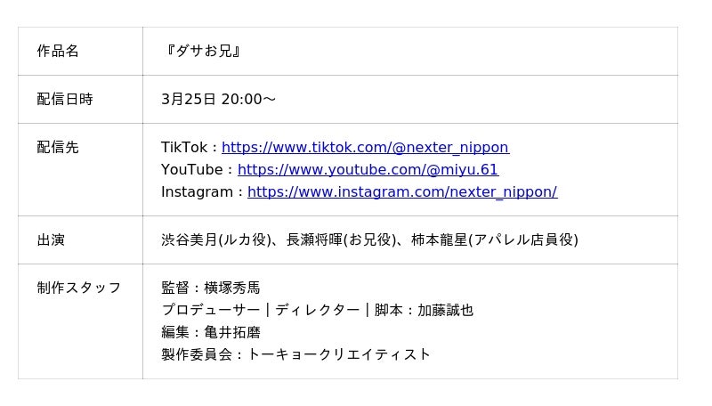 ネクスター株式会社(本社:東京都新宿区、代表取締役CEO:細田 悠巨)グループの「TOKYO creatist」は、兄妹のコミカルなやり取りとファッションによる自己変革をテーマにした縦型ショートドラマ『ダサお兄』を本日公開いたします。また、本作品の公開を記念し、ショート動画制作を「制作原価」にてアパレル関連会社5社限定で提供する、特別な制作支援キャンペーンの実施を発表いたします。