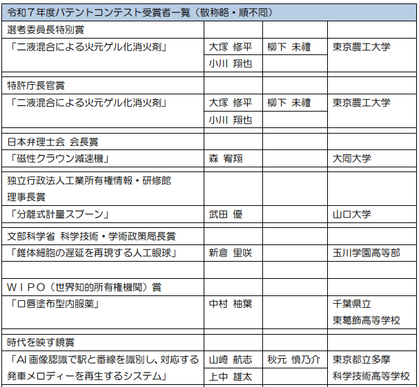 このコンテストで優秀賞として表彰された応募作品は、特許または意匠登録出願支援対象となり、日本弁理士会の弁理士が手続き等を指導し、実際に特許庁への出願を行うことができます。