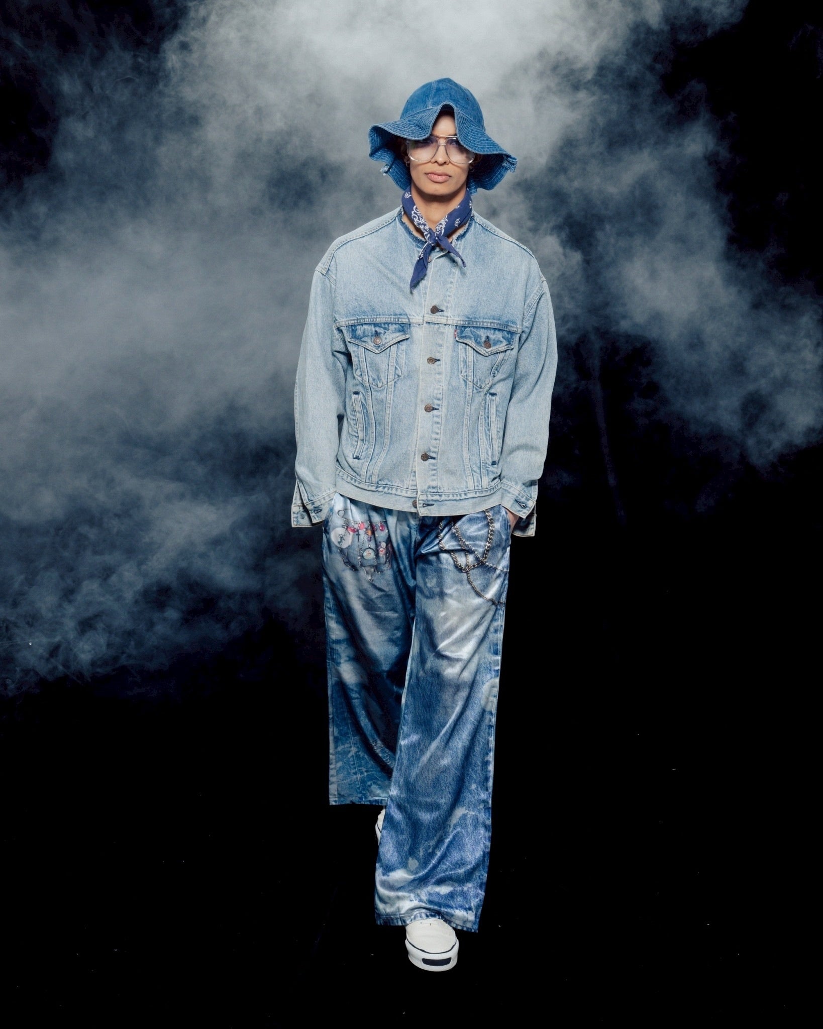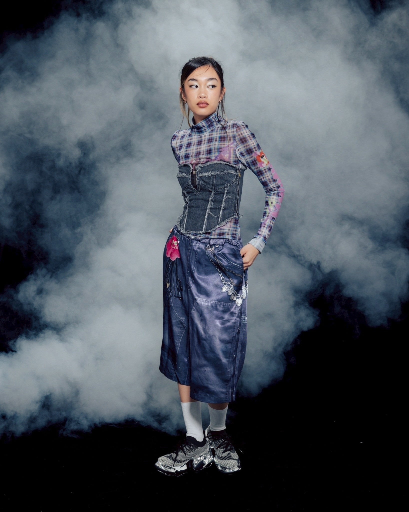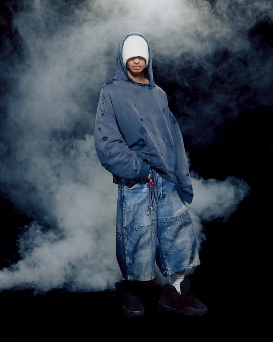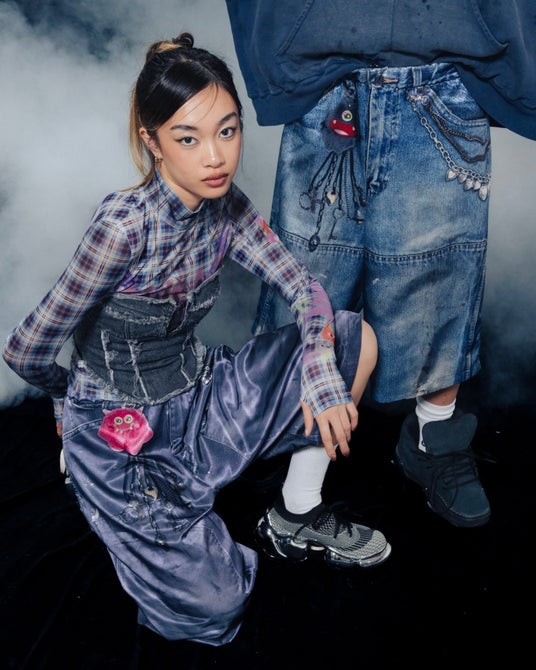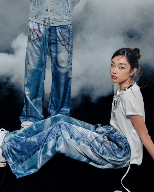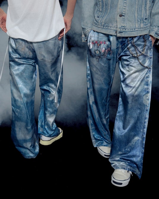 シルエットは昨今熱を帯びているバギーシルエット。腰回りはモンスターチャーム、チェーンのディテールで遊び心あふれるデザインに。