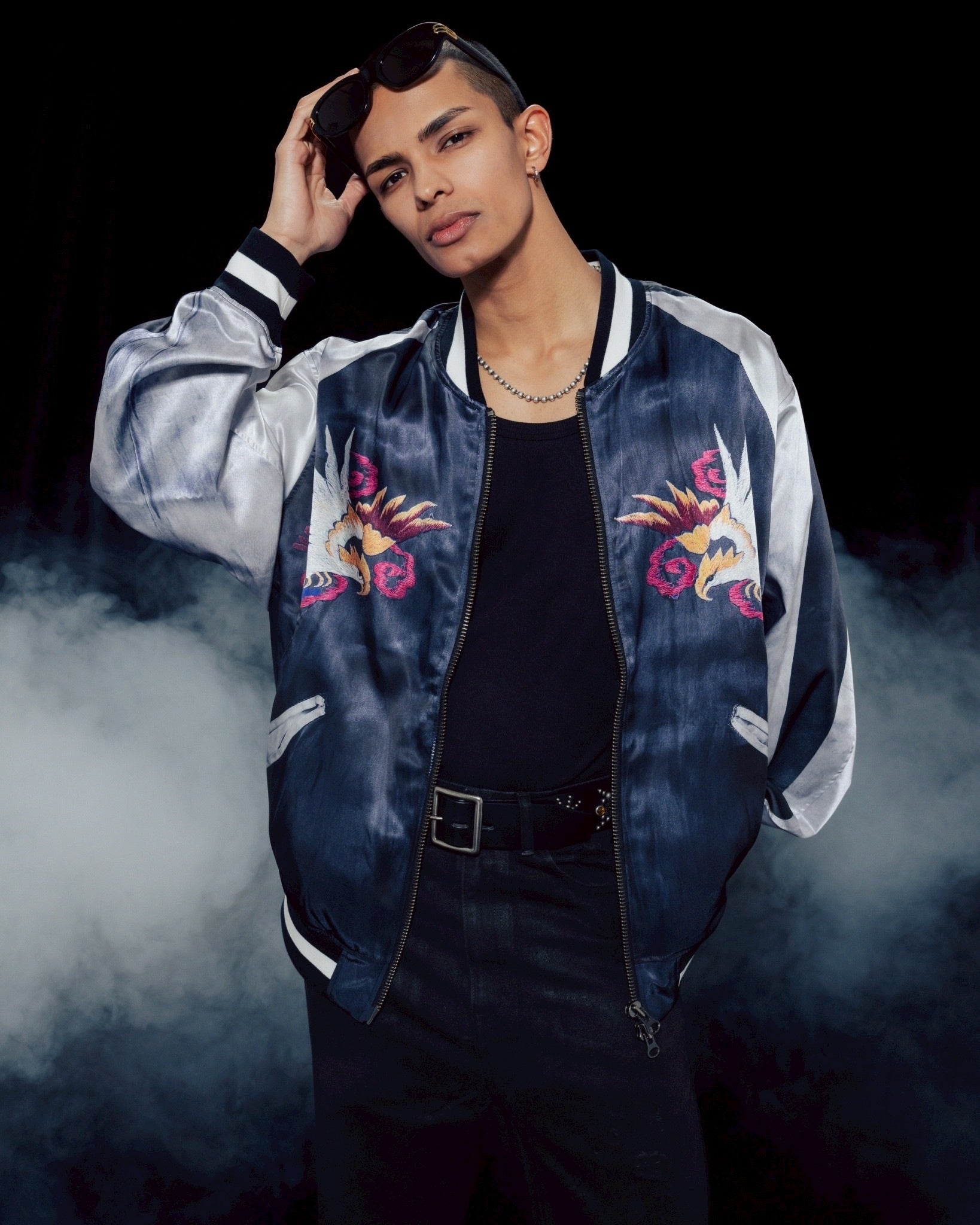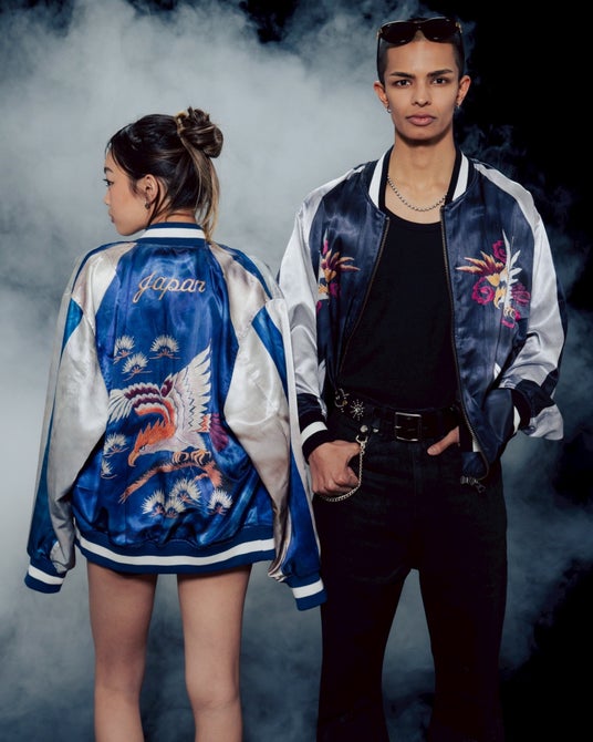 特徴的な手作業での刺繍を鮮明にプリントする為、グラフィック上で、刺繍糸一本一本を画像で処理しリアルさを追求。素材はVINTAGEのサテンスカジャンよりも厚みの薄い物を採用。シルエットはVINTAGEにはないゆとりのあるサイズ感とドレープの効いたデザインが現代のシーンにマッチしたアイテムとなっています。