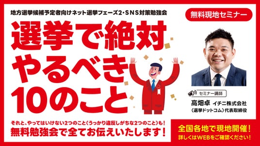 日本最大級の政治・選挙情報プラットフォーム「選挙ドットコム」を運営するイチニ株式会社(東京都渋谷区、代表取締役:高畑 卓)は、地方選挙候補予定者・関係者を対象に、実践的なネット選挙対策セミナーを2026年4月・5月に全国各地で開催します。