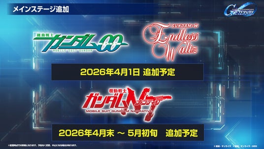 4月1日より『機動戦士ガンダム00』(後半)と『新機動戦記ガンダムW Endless Waltz』がメインステージに追加予定です。
