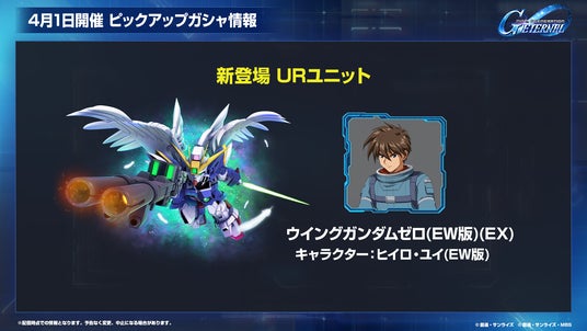4月1日から開催予定のピックアップガシャには、期間限定ユニットとしてUR「ウイングガンダムゼロ(EW版)(EX)/UR「ヒイロ・ユイ(EW版)」とUR「ダブルオーライザー(最終決戦仕様)(EX)/UR「刹那・F・セイエイ」が登場予定です。さらに、UR「トールギスIII(EX)」とUR「プリベンター・ウインド」と、期間限定サポーターとしてUR「スメラギ・李・ノリエガ&プトレマイオス2」も登場します。