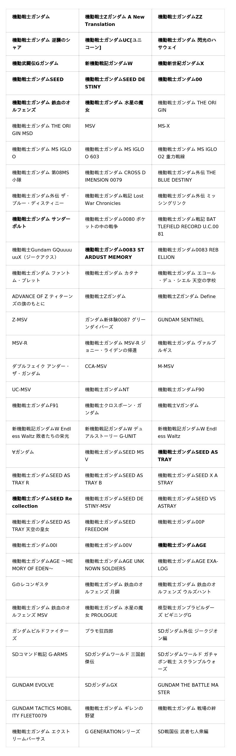 ※太字はメインステージ及び、ヒストリーステージとしてシナリオが収録されている作品です