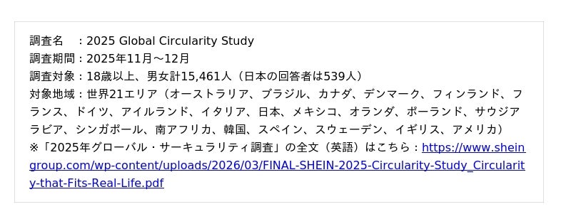 ファッション&ライフスタイルのグローバルオンラインブランドSHEINは、日本を含む、世界21エリア・15,461人を対象とした「2025年グローバル・サーキュラリティ調査(2025 Global Circularity Study)」を発表しました。