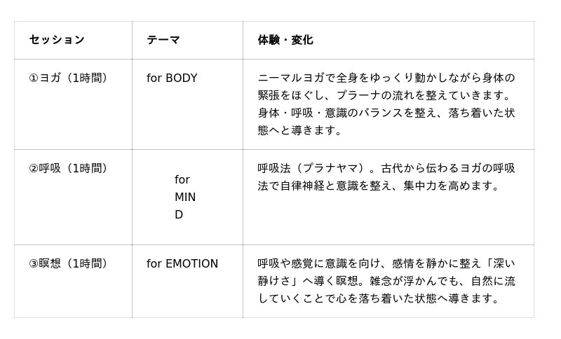 スポーツのトライアスロンが水泳・自転車・ランニングの3種目を一日で完走するように、YOGA TRIATHLONはヨガ(Body)・呼吸(Mind)・瞑想(Emotion)という3つの実践を、各1時間・ひとつの流れとして体験するプログラムです。