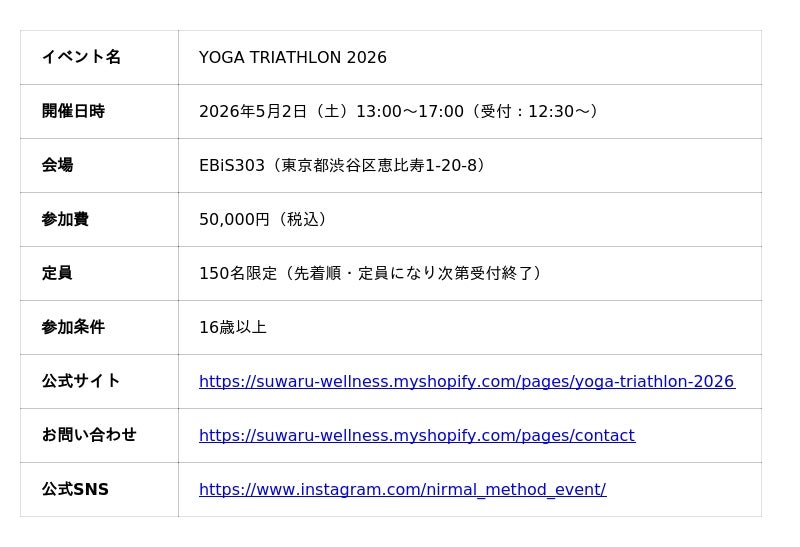 スワル株式会社(本社:東京都渋谷区広尾、代表取締役:石古暢良)は、ヨガ・呼吸法(プラナヤマ)・瞑想を一つの流れとして体験するプレミアムイベント「YOGA TRIATHLON 2026」(ヨガトライアスロン)を、2026年5月2日(土)13:00~17:00、東京・恵比寿のイベントスペース EBiS303 にて開催します。定員は150名限定。