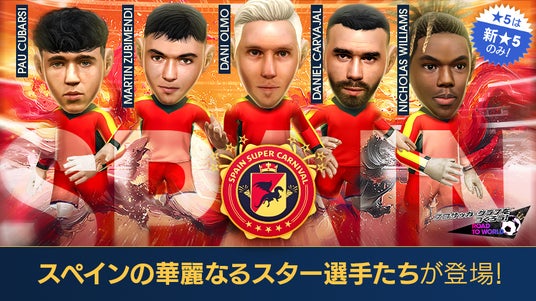 「ダニ・オルモ」「マルティン・スビメンディ」「ダニエル・カルバハル」「パウ・クバルシ」「ニコ・ウィリアムズ」「ゴンサロ・ガルシア」「ダニ・セバージョス」「アイメリク・ラポルテ」「ウナイ・シモン」「アレハンドロ・グリマルド」「ミケル・オヤルサバル」といったスペインのスーパースターが、得意戦術ポゼッションの新★5選手として登場する“SPAIN SUPER CARNIVAL SCOUT”を開催! あわせて、★4バージョンの選手たちがもらえる“スペシャルログインボーナス”も実施します。