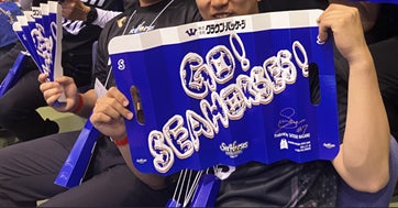 会場にリサイクルステーションを設置し、食べ終わった観客に容器の解体・フィルムの剥がし方を体験してもらいます。楽しく体験してもらうために、今回初めて「遊び」の要素を取り入れます。チーム名の「シーホース=タツノオトシゴ」にちなんで、解体した容器の形を海の生き物に見立て、「カニ」や「クリオネ」のイラストが描かれたダストボックスを用意。容器の形に合う生き物のイラストが描かれたボックスに入れてもらいます。回収した段ボールは、すべて古紙回収業者へ受け渡し、新たな段ボールの原料として再利用されます。