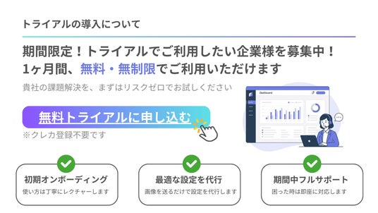 本キャンペーンでは、1ヶ月間すべての機能を無料・無制限でご利用いただけるほか、初期オンボーディングやお客様に合わせた設定の代行・期間中のフルサポートをすべて無料で提供いたします。クレジットカード登録不要、トライアル終了後の自動課金もありません。