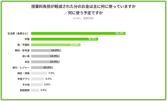 授業料負担が軽減された(または軽減見込みの)お金の使い道(複数回答、n=641)では、1位「生活費(食費など)」(43.5%)、2位「貯蓄」(30.9%)、3位「塾/予備校」(22.8%)でした。