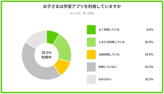 「お子さまは学習アプリを利用していますか」では、「よく利用している」(8.6%)と「ときどき利用している」(20.9%)を合わせた29.5%が現在利用中と回答しました。