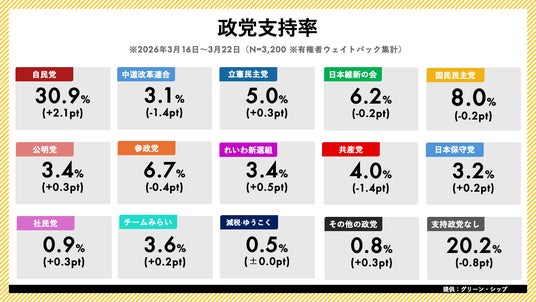ジャッグジャパン株式会社(本社:東京都渋谷区)は、株式会社グリーン・シップ(本社:東京都千代田区)と業務提携し、グリーン・シップが提供する日次世論調査「世論レーダー」のデータを提供しております。本日、2026年3月第4週(3月16日~3月22日分)の内閣支持率・政党支持率調査の結果を発表いたします。