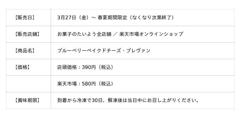 株式会社太陽社(所在地:千葉県匝瑳市飯倉293、代表取締役:片岡正裕)が展開する、千葉県で長年愛され続ける菓子店「お菓子のたいよう」は、「凍ったままでも美味しい」という新しい楽しみ方を提案する、千葉県産米粉100%の完全グルテンフリー「ブルーベリーベイクドチーズ・ブレヴァン」を3月27日(金)より発売いたします。温度によってアイスのような食感から濃厚チーズケーキへと変化する、ひとつで三度美味しいこの春夏限定スイーツです。