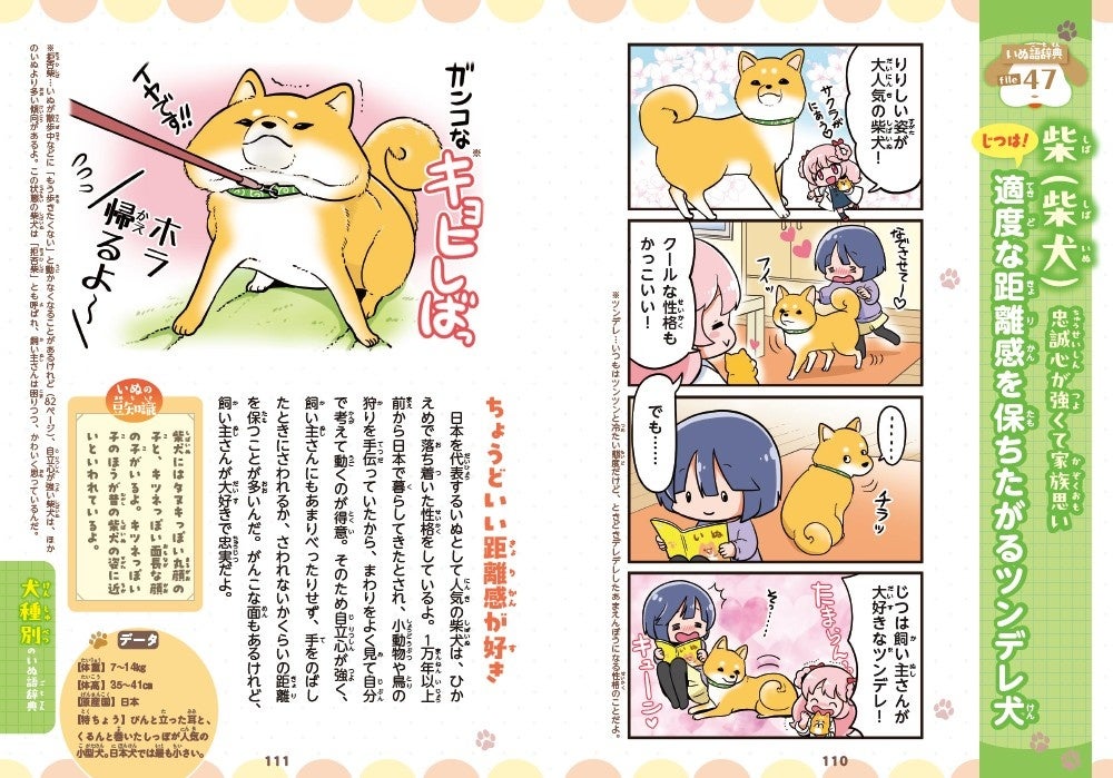 「いぬは人間の約6倍ほど耳がいいとされる」、「いぬが年を取ると、しらがのような白い毛が交じることも」などの「いぬの豆知識」や、第4章では体重や原産国などの「犬種別データ」も掲載。雑学満載で、さらにかわいい写真ページもあり、いぬについて詳しくなれる一冊です!