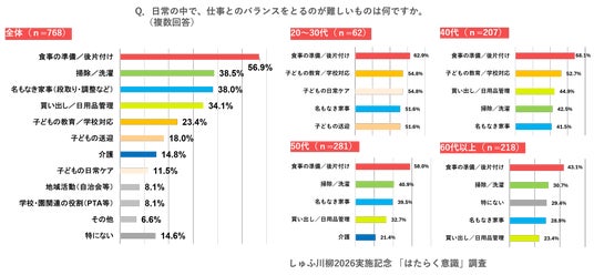 日常の中で仕事とのバランスをとるのが難しいものについて、「食事の準備/後片付け」が56.9%で最も多く、次いで「掃除/洗濯」(38.5%)、「名も無き家事(段取り・調整など)」(38.0%)となりました。仕事と家庭を両立するうえで、日常的な家事負担が大きいことがうかがえる結果となりました。また、年代別に見ると、20代~40代では「子どもの教育/学校対応」や「子どもの日常ケア」など子育てに関する負担が高い傾向が見られました。一方で、50代以降では「介護」などの割合が相対的に高くなっており、ライフステージによって両立の難しさの内容が異なることが明らかになりました。