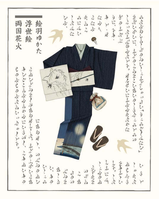 浮世絵「両国花火」や百鬼夜行をモチーフにしたゆかたをはじめ、帯や装身具など、江戸の遊び心を現代の装いとして提案するコレクションです。