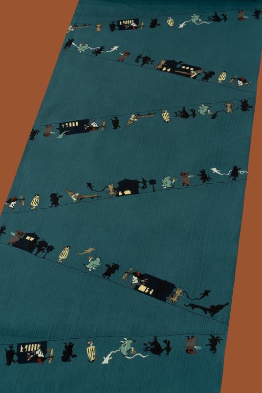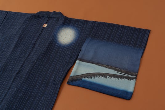 宵闇に咲く花火の光や、どこか憎めない妖怪たちの姿など、江戸の人々が楽しんだ「宵涼み」。粋でありながら思わず頬がゆるむ、江戸の遊び心が息づくゆかた、帯、装身具を制作しました。江戸の夜を題材に、涼やかさと洒落たユーモアを織り込んだ夏の装いです。