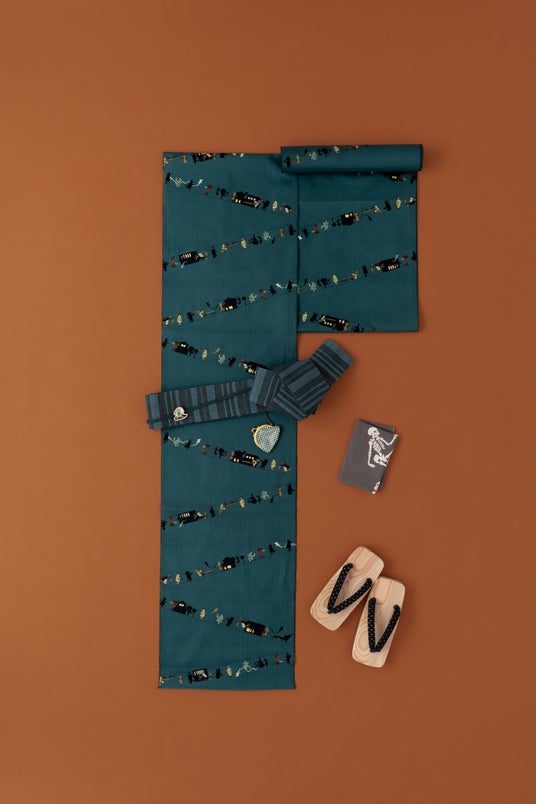 どこかユーモラスな妖怪たちが闇夜を行き交う百鬼夜行を描いた一着。江戸の遊び心と粋な笑いをまとえる、夏ならではのゆかたです。帯留には、愛嬌たっぷりのからかさ小僧がひょっこりと潜んでいます。