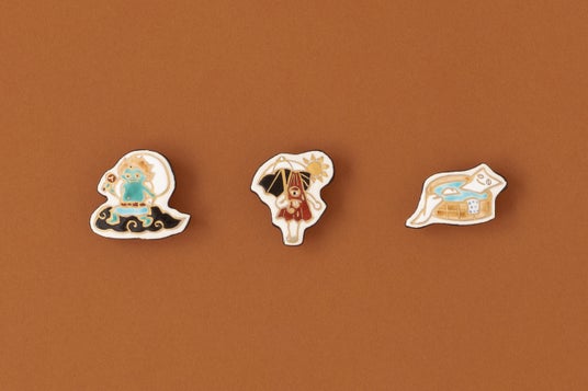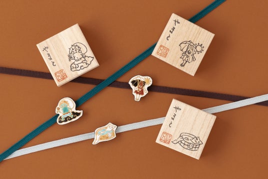 暑い夏、妖怪たちが涼んでいる様子を描いた帯留シリーズ。ハンディファンを持つ風神や、日傘で日差しを凌ぐからかさ小僧、水浴びをする一反木綿など、愛嬌のある姿を表現しました。陶の土台に彩り豊かな絵付を施し、一点一点手作業で仕上げています。涼怪のイラストが描かれた箱付きです。