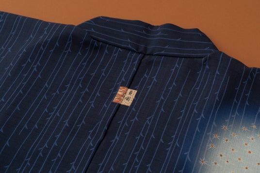 夜の始まりを思わせる深く渋い青「裏色」で染め上げた一枚。この色は江戸時代、きものの裏地や夜具にも用いられ、静かな闇を思わせる趣があります。可愛らしい風神の帯留を添えた、さりげない遊び心のあるメンズゆかたスタイルです。