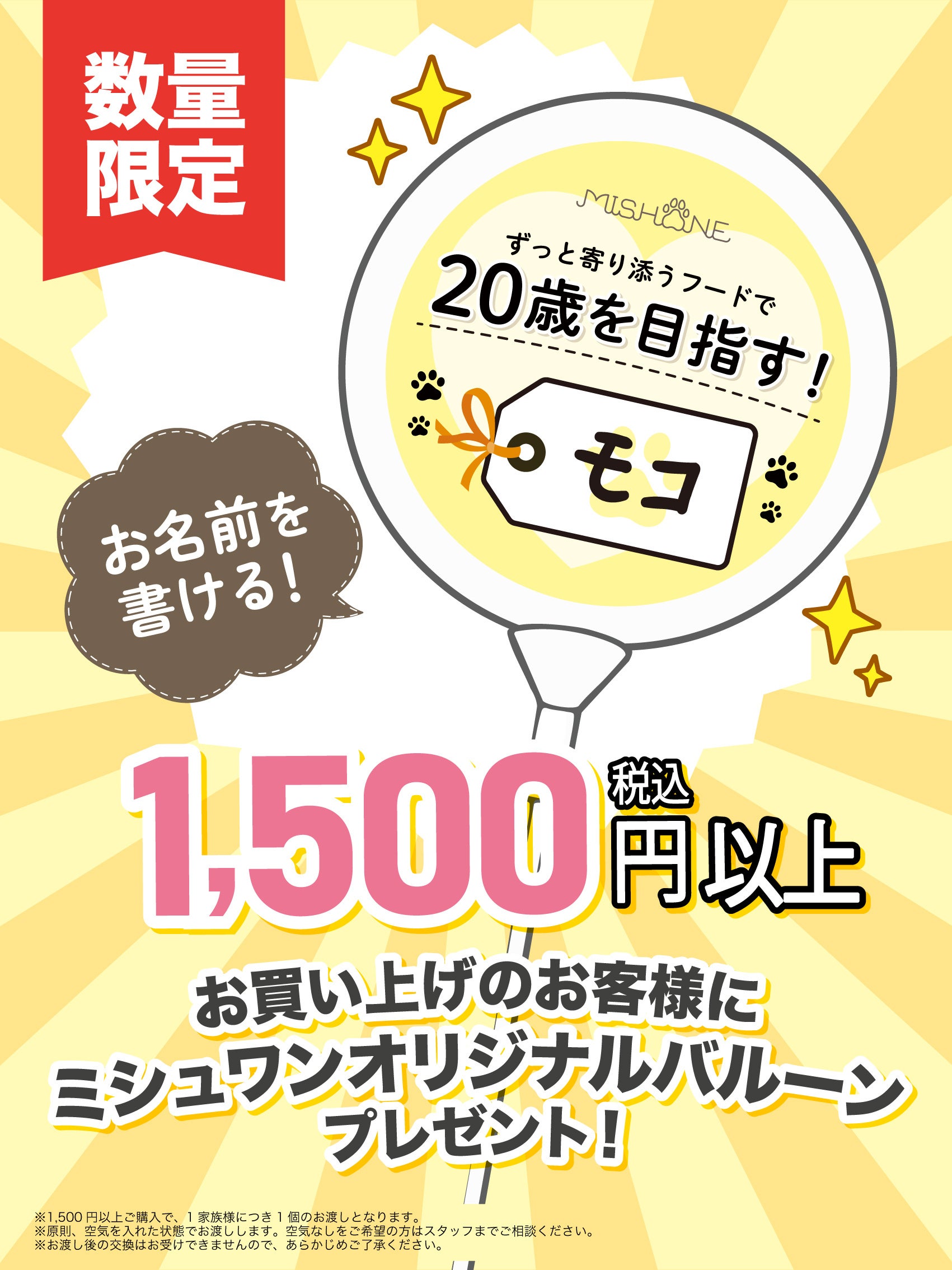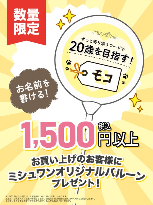 当日、ミシュワンブースにて1,500円(税込)以上お買い上げいただいたお客様に、ミシュワンオリジナルデザインの可愛いバルーンをプレゼントいたします。愛犬とのお出かけや、イベント会場での記念撮影にもぴったりなアイテムです。