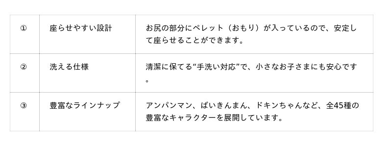 『プリちぃビーンズ コレクション』とは『プリちぃビーンズ コレクション』は、アンパンマンに登場するキャラクター全45種を展開しており、1.5歳から楽しめるコンパクトサイズのぬいぐるみシリーズです。
