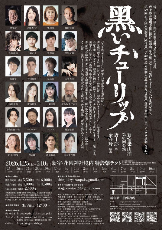 一般社団法人新宿梁山泊主催、第81回公演『黒いチューリップ』が2026年4月25日 (土) ~ 2026年5月10日 (日)に新宿 花園神社境内 特設紫テント(東京都 新宿区 新宿 5-17-3)にて上演されます。 チケットはカンフェティ(運営:ロングランプランニング株式会社、東京都新宿区、代表取締役:榑松 大剛)にて発売中です。