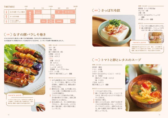 焦らず、無理せず料理を作るためには、作業を手際よく進めるちょっとしたコツがあります。本書では、nanaさんの段取りタイムテーブルと、30分でスムーズに3品献立を完成させるレシピを掲載。