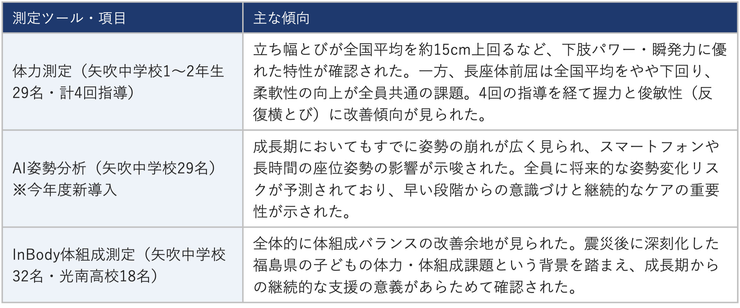矢吹中学校(サッカー部・陸上競技部 中学1~2年生)および福島県立光南高校(女子ハンドボール部・女子バレーボール部 合同)を対象に、プロ・トップアスリートの指導経験を持つトレーナーが運動指導を実施しました。矢吹中学校では計4回、光南高校では1回の指導を行っています。3年目となる今年度の最大の特徴は、AI姿勢分析(シセイカルテ)を新たに導入したことです。これにより、これまで実施してきた体力測定・InBody体組成測定と合わせた3種のデジタルデータが初めて揃い、一人ひとりの身体の状態をより多角的に把握できる環境が整いました。測定回数を重ねるごとに、生徒が自分の体について自発的に話すようになる場面が生まれており、データが指導者と生徒の対話のきっかけとして機能することが確認できました。
