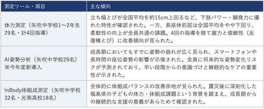 令和8年度も学校側と協議を行い、継続して実施する予定です。体力・体組成・姿勢の3軸データを年度をまたいで蓄積していくことで、生徒一人ひとりの成長の変化を長期的に把握し、競技力向上とスポーツ障害予防の両面に活用していくことを目指します。