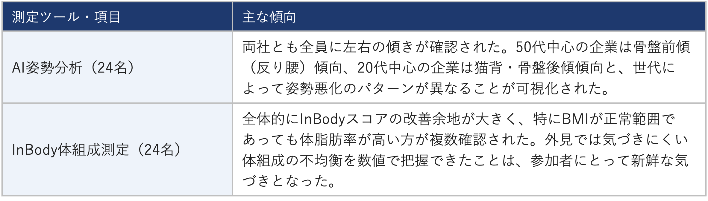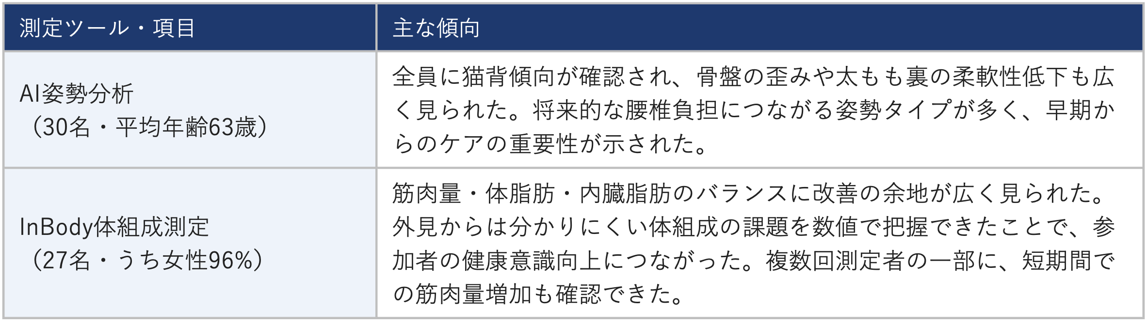 働き世代の健康支援として、今年度から新たに「企業訪問型」のヘルスケアプログラムを試験的に実施しました。企業へトレーナーが出向き、InBody体組成測定とAI姿勢分析を実施しています。健康診断以外の機会に自分の身体の状態を詳しく把握することが難しい働き世代に対して、職場という身近な場所でアプローチする今回のモデルは、地方企業における健康経営支援の一つの形として機能することが確認できました。また、年齢層によって姿勢の崩れ方や体組成の課題が異なることも明らかになっており、世代に応じたプログラム設計の必要性が示されています。