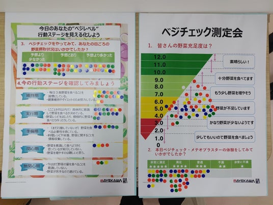 従業員が利用する食堂にて、保健師・管理栄養士が加わったイベントを企画し、従業員向けにベジチェック(R)、メテオブラスター(簡易視野検査)、握力測定、アンケート調査といった内容を実施しました。アンケートでは当イベントへの関心度・満足度は高く、野菜の摂取量についての行動変容まで促す良い機会となりました。