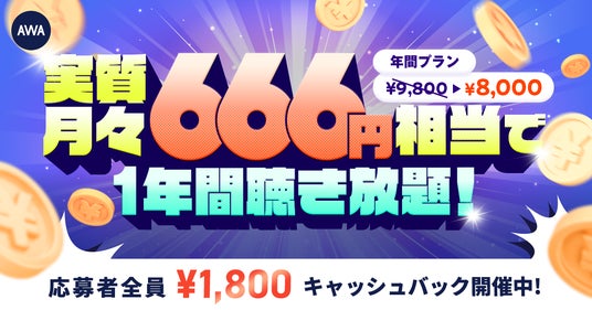 AWA株式会社(本社:東京都港区、代表取締役CEO:冨樫晃己)が運営する、サブスクリプション型(定額制)音楽ストリーミングサービス「AWA(アワ)」は、2026年3月25日(水)より、AWA STANDARD年間プランをご登録いただいた方を対象に、1,800円キャッシュバックキャンペーンを開催いたします。