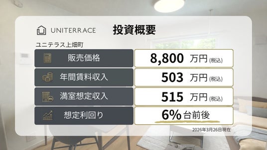 ユニテラス上畑町の投資概要はこちら。2026年3月現在、満室で稼働しています。